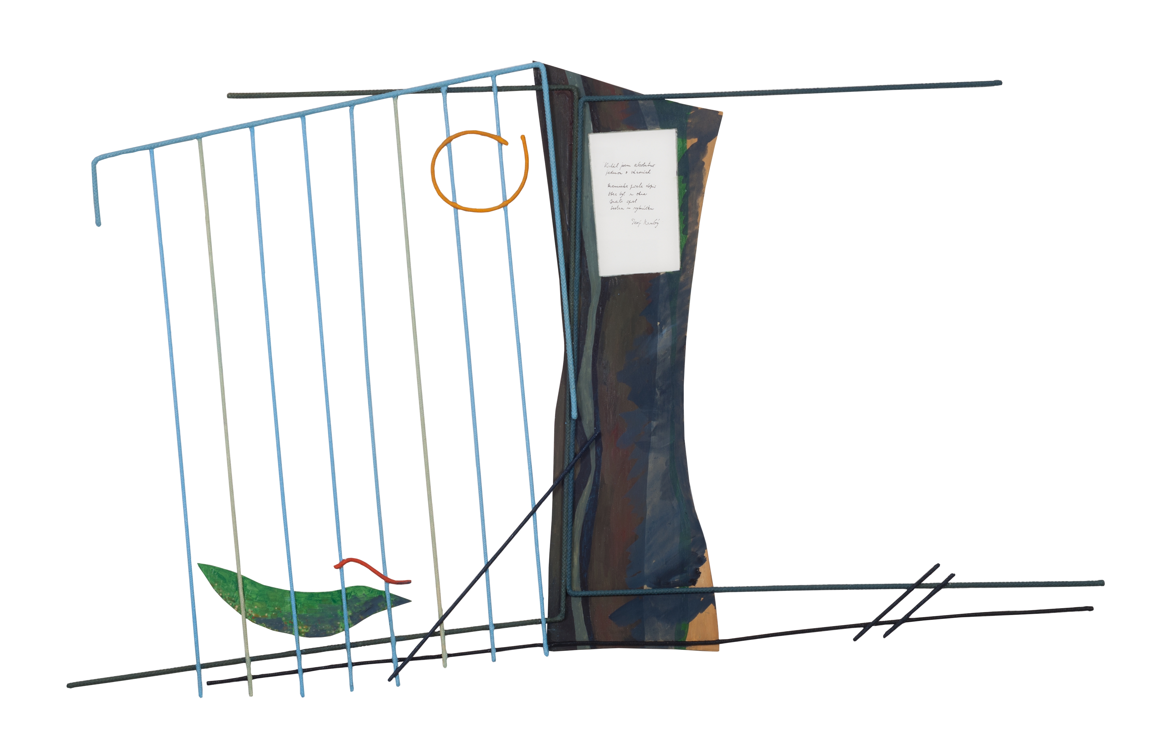 Einige Jahrzehnte später wandte sich Jiří Kubový an den Pilsner Dichter Josef Hrubý für eine ähnliche Zusammenarbeit. Hrubý beschäftigte sich seit den 1960er Jahren neben seiner Lyrik auch mit der Collage, die in den Sammlungen des Olmützer Kunstmuseums und der Westböhmischen Galerie in Pilsen vertreten ist. Er zog jedoch geschriebene Gedichte der kollaborativen Arbeit vor. In den Jahren 2014 und 2015 schufen Jiří Kubový und der Dichter Josef Hrubý eine Reihe von zehn Bildassemblagen mit dem einfachen Titel Poem and Landscape. Sie basieren auf der Integration eines Gedichts in Form eines Autogramms in ein Objektgemälde, das aus mit Stoff überzogenem Draht, Latten und flachen Formen aus Sololith gebildet wird. Die Komposition erinnert an die Seiten eines aufgeschlagenen Buches. Zwei Sprachen, zwei Ausdrucksformen menschlicher Transzendenz, zwei phantasievolle Darbietungen und eine doppelte poetische Reflexion über die Welt haben sich harmonisch zusammengefunden, um etwas ganz natürliches zu schaffen: das im Bild verkörperte Wort.
