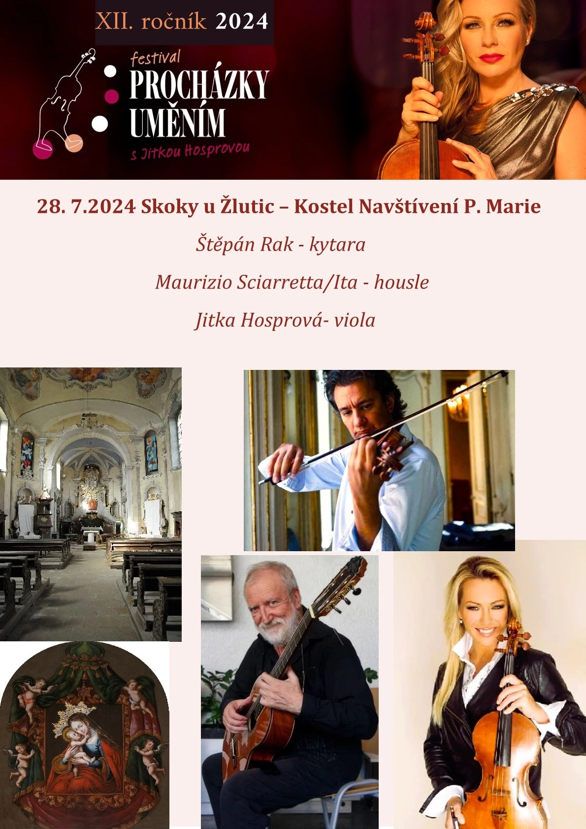 Die barocke Wallfahrtskirche Mariä Heimsuchung in Skoce bei Žlutice ist eines der Juwelen, die sicherlich die Aufmerksamkeit der Öffentlichkeit verdienen und heute ein attraktiver Ort für Geschichtsliebhaber sind. Sie wurde aufgrund der Erscheinungen der Jungfrau Maria und der mit diesem Ereignis verbundenen Wunder erbaut und war lange Zeit mit der Geschichte der Familie Kokoř verbunden. Das Programm wird daher aus den Höhepunkten und Hauptwerken des Barocks und den Originalwerken der tschechischen Gitarrenlegende Štěpán Rák zusammengestellt. Die Chaconne aus der Partita Nr. 2 von J. S. Bach wird von dem italienischen Geigenvirtuosen Maurizio Sciarretta gespielt, der mit beiden Künstlern auftritt, und gemeinsam werden sie weitere Teile des Programms bestreiten. Das Konzert ist Teil der Reihe „Auf den Spuren der Herren von Kokořov“.