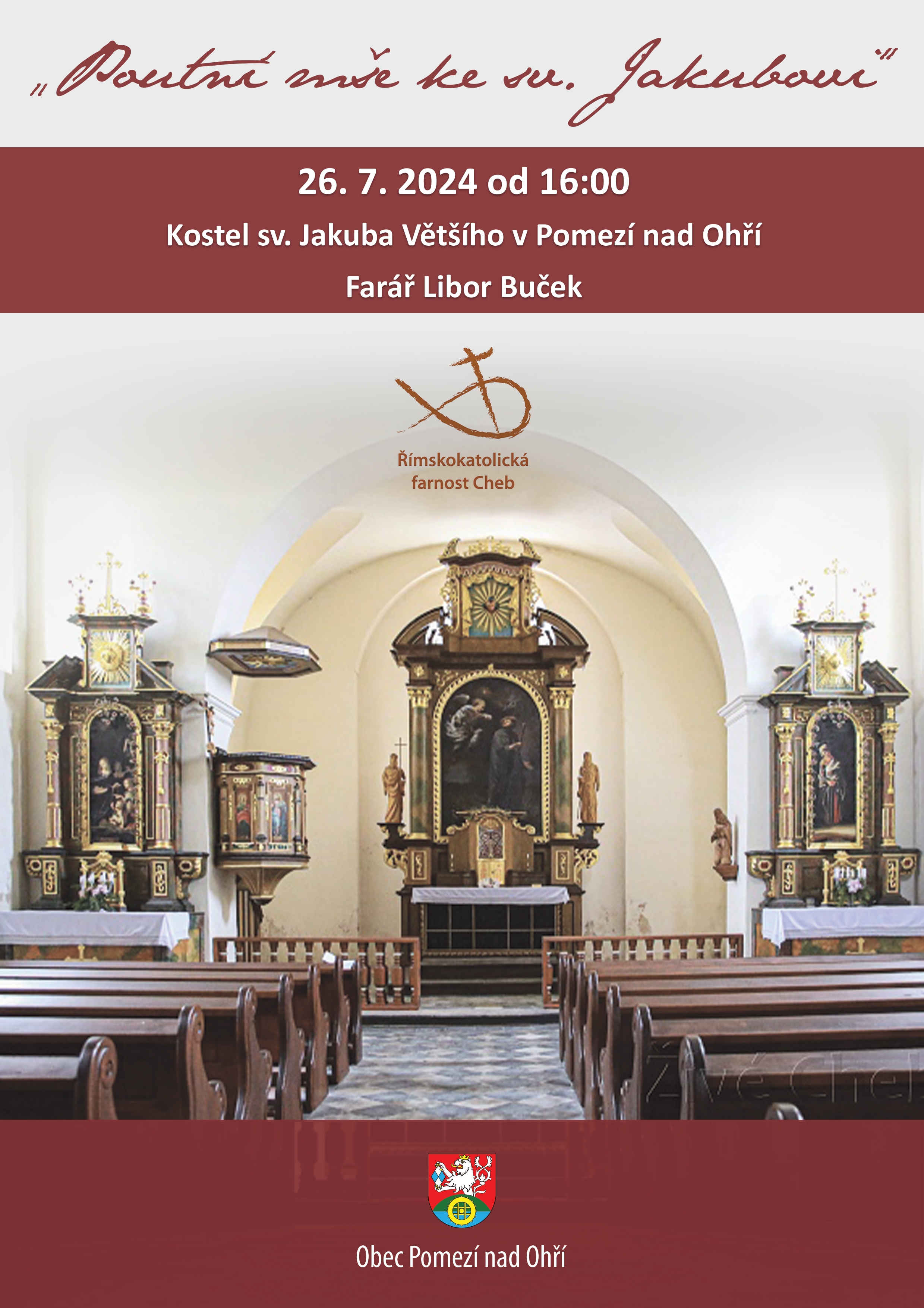 Pilgermesse Pilgermesse zum Heiligen Jakobus in der Kirche St. Jakobus der Große in Pomezí nad OhříVeranstaltungsortPomezí nad Ohří čp.18 350 02 ChebKarlsbader Bezirk, TschechienTermin 26.07.2024 16:00 - 17:00 PreisekostenlosVeranstalter Pomezí nad Ohří – KulturabteilungKarte Pomezí nad Ohří čp.18 350 02 Cheb » Routenplanung öffnen