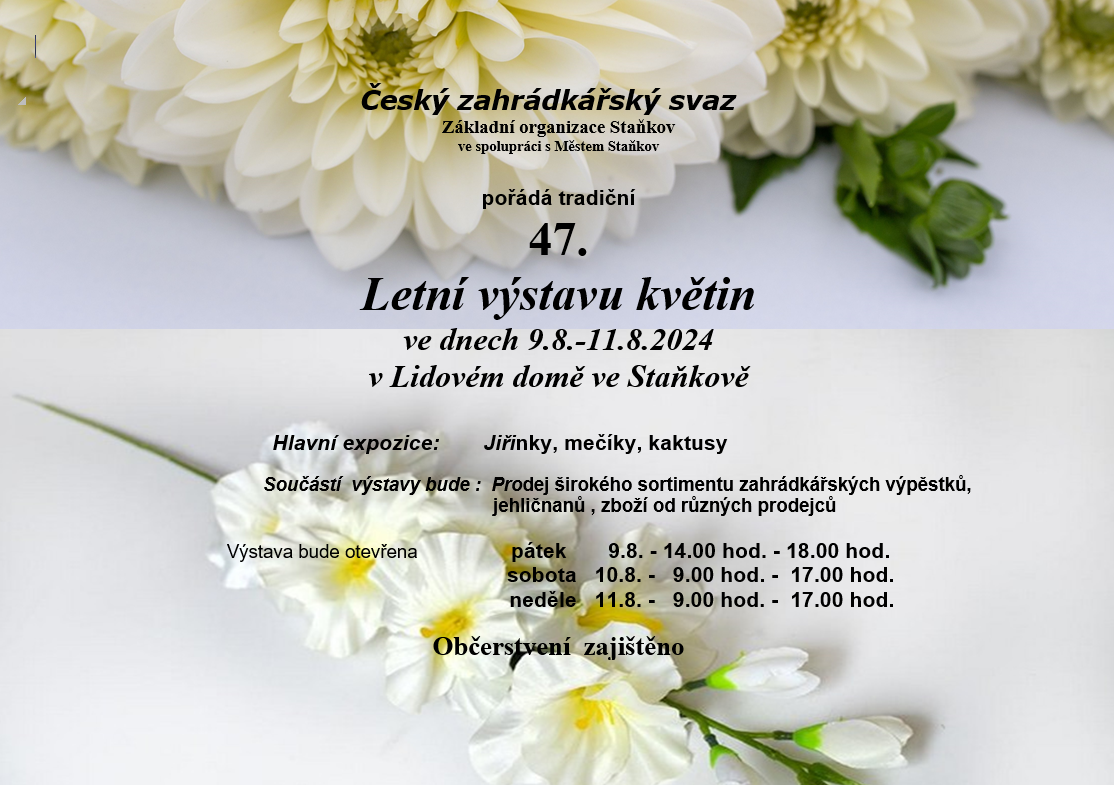 Die tschechische Garten Union Staňkov in Zusammenarbeit mit der Stadt Staňkov veranstaltet vom 9.8. 2024-11.8. 2024 in Staňkov in Domažlice Bezirk eine traditionelle Sommerblumenausstellung. Die Hauptexposition besteht aus Dahlien, Gladiolen und Bonsai. Im Rahmen der Ausstellung wird eine breite Palette von Gartenbaupflanzen, Waren von verschiedenen Anbietern verkauft. Imbiss wird verschafft.
