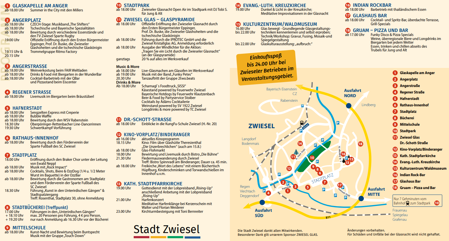 Jedes Jahr Mitte August ( um “Mariä Himmelfahrt”) verwandelt sich die Zwieseler Innenstadt einen Abend lang in eine Partymeile, auf der unter dem Motto “Glas-Feuer-Licht” an verschiedenen Plätzen der Stadt gefeiert wird. Traditionell wird die Glasnacht von dem amtierenden Bürgermeister sowie der Glaskönigin eröffnet. Schwedenfeuer und Windlichter aus Glas weisen allen Besuchern im Anschluss den Weg zu den einzelnen Veranstaltungsorten, an denen ein abwechslungsreiches Programm angeboten wird. Live-Musik, Glasvorführungen und kulinarische Leckereien sorgen bis weit nach Mitternacht für beste Stimmung.