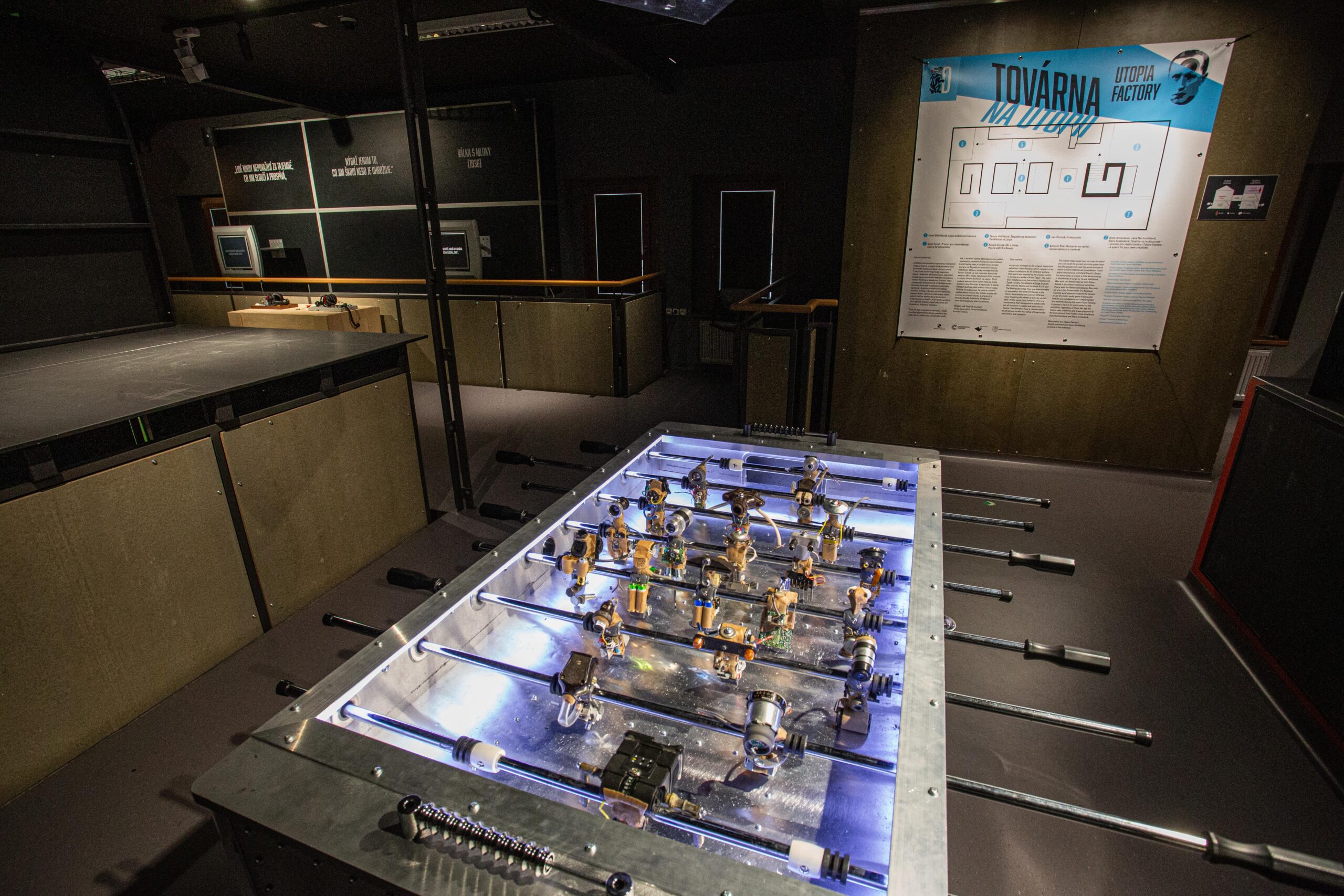 Die interaktive Ausstellung besteht aus fünf originellen Installationen verschiedener Künstler. Sie wurden von den utopischen Motiven in den literarischen Werken von Karel Čapek inspiriert. Die einzelnen Installationen sind die Reaktionen der Autoren auf Čapeks Romane Die absolute Fabrik, Krakatit, Krieg mit den Molchen und die Dramen R.U.R. und Die Makropulos-Affäre.