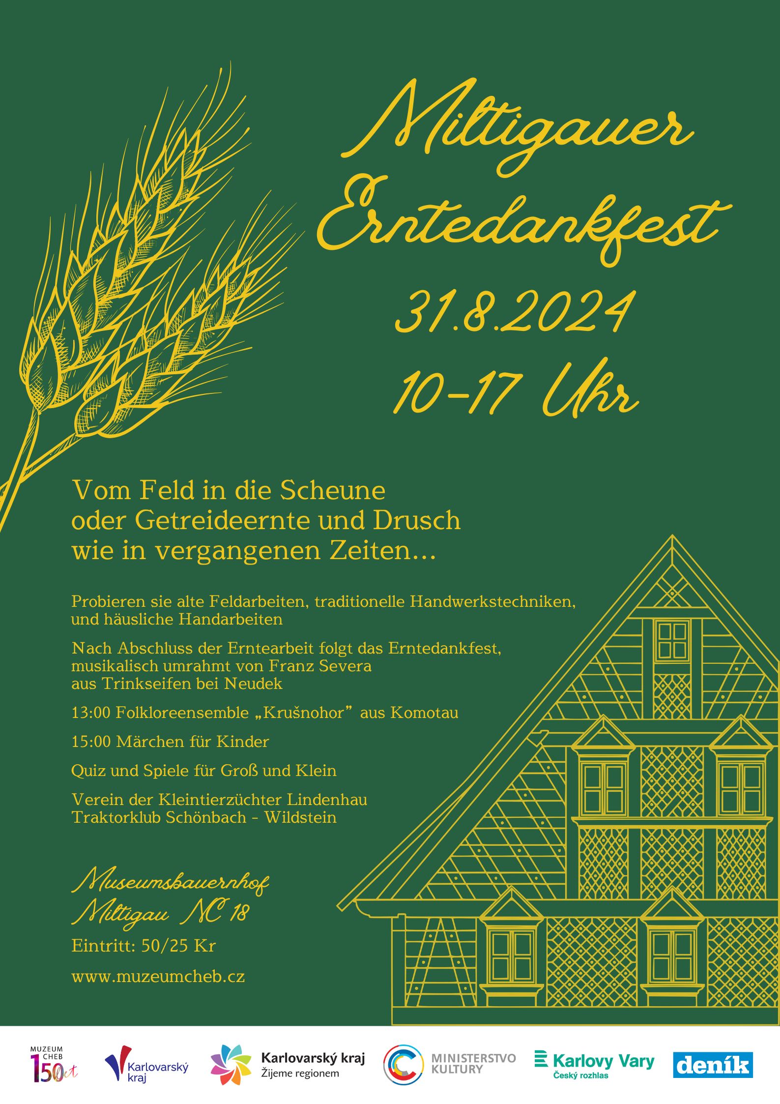 Die Besucher können ältere landwirtschaftliche Arbeiten, traditionelles Handwerk oder Heimwerkerarbeiten ausprobieren. Nach der Ernte gibt es ein Erntedankfest mit musikalischer Begleitung von Franz Severa aus Rudné bei Nejdek.