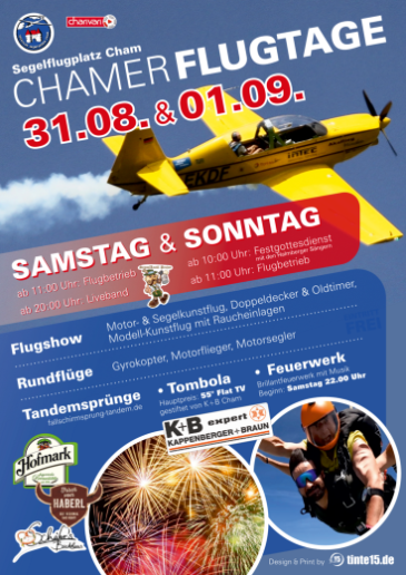 Auch dieses Jahr veranstaltet der Segelflug-Sportverein Cham wieder die inzwischen überregional bekannten Chamer Flugtage. Neben Frühlings- und Volksfest gehören die Flugtage mit zu den größten Festen in der Kreisstadt und locken jedes Jahr viele Gäste aus Nah und Fern auf’s Chamer Segelfluggelände. Dieses Jahr können wir zu den altbekannten einige wirklich neue Highlights präsentieren.