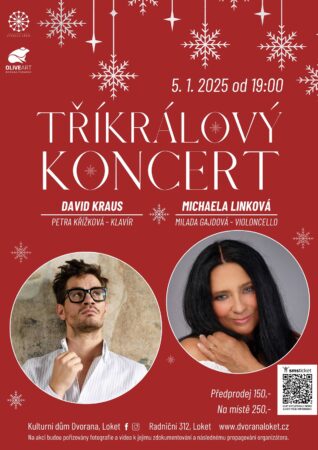 Wir begrüßen das neue Jahr 2025 mit dem Dreikönigskonzert in der Dvorana. Der Abend wird von dem bekannten tschechischen Sänger David Kraus, der Mezzosopranistin Michaela Linková, der Pianistin Petra Křížková und der Cellistin Milada Gajdová gestaltet.