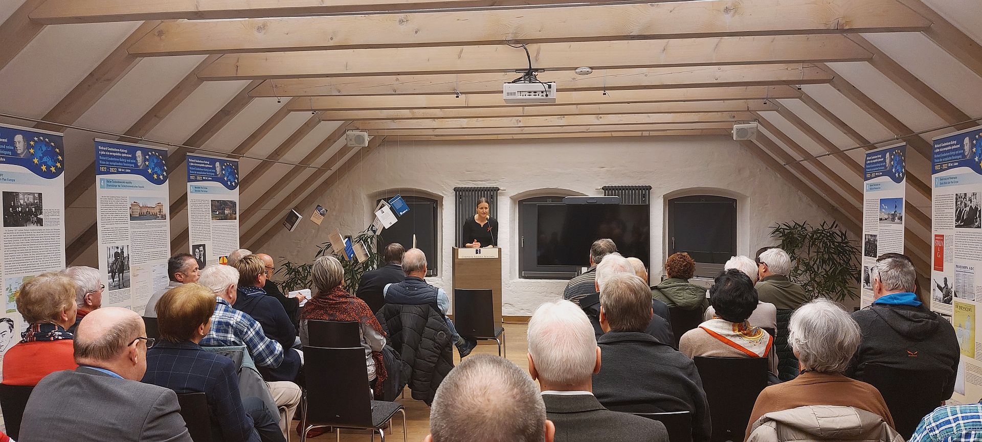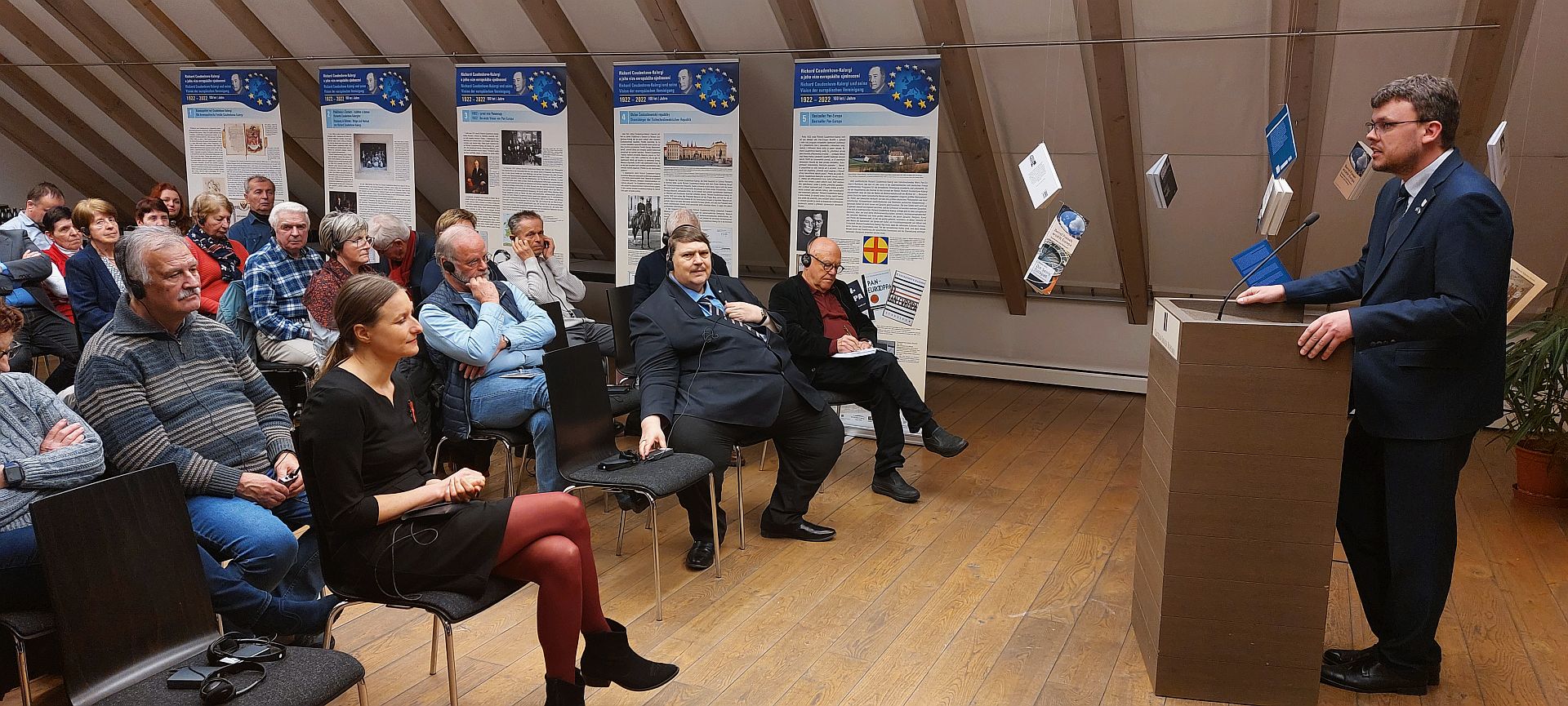 Über ein volles Haus freute sich am Dienstag CeBB-Leiterin Dr. Veronika Hofinger bei der Eröffnung von zwei Ausstellungen zu großen Europäern. Die Nähe zu Graf Richard Coudenhove-Kalergi, der vor hundert Jahren mit dem Manifest „Pan-Europa“ seine Idee eines politisch geeinten Europas vorstellte, ist nicht nur den grenzübergreifend versöhnenden Themen geschuldet, denen sich das Haus seit der Eröffnung widmet. Sie hängt auch damit zusammen, dass des Grafen Heimatstadt Poběžovice (Ronsperg) seit 1998 mit Schönsee, Stadlern und Weiding in einer Partnerschaft verbunden ist. Martin Kopecký, Bürgermeister der Partnerstadt, zeigt sich beim Grußwort stolz über den großen Sohn. Seine Hoffnung ist, dass im Schloss ein würdiger Ort zum Andenken an Graf Richard Coudenhove-Kalergi entsteht.