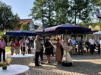Gab es bei früheren Sommerempfängen oft bange Blicke gen Himmel, so zeigte sich heuer der Sommer von seiner besten Seite. Richard Tischler, stellv. Landrat und Bürgermeister der Stadt Pfreimd, unterstrich bei seiner Eröffnungsworten, wie wichtig Begegnungen sind und wie diese das öffentliche, kulturelle und grenzüberschreitende Leben bereichern. „Was für eine großartige Gelegenheit, sich auszutauschen, gut gelaunt zu sein und an einem lauen Sommerabend grenzüberschreitend miteinander zu feiern.“ Wer den erst seit ein paar Monaten amtierenden Oberpfälzer Regierungspräsidenten Walter Jonas noch nicht kannte, der spürte bei diesen ersten Sätzen seiner Rede, da steht ein Repräsentant des Staates vor uns, der neben Verordnungen und Gesetzesparagrafen auch das zwischenmenschliche Leben zu schätzen weiß. Unkompliziert, engagiert und direkt aufeinander zugehen sind seine Schlüsselbegriffe für das bayerisch-tschechische Miteinander und dessen Zukunft, das „in den Händen unserer Jugend und der nächsten Generationen liegt, die genauso wie wir nicht aufhören dürfen, Brücken zu bauen“. Der Regierungspräsident hat sich noch vor dem offiziellen Beginn die Sommerausstellung mit Fotografien von Herbert Pöhnl und Edmund Stern angeschaut, um seine Eindrücke mit in seine Eröffnungsworte zu packen. „Die Ausstellung visualisiert das bayerisch-tschechische Miteinander von BürgermeisterInnen und zeigt einerseits die Unterschiede, vor allem aber auch die Gemeinsamkeiten. Ohne Bildunterschrift wäre nicht zu unterscheiden, ob es sich bei den Portraits um bayerische oder tschechische Gemeindeoberhäupter handelt. Vor allem zeigt es, sie haben Humor, diesseits und jenseits der Grenze. Sie begegnen sich, sie erleben Gemeinsamkeit, sie lachen und haben Freude“.