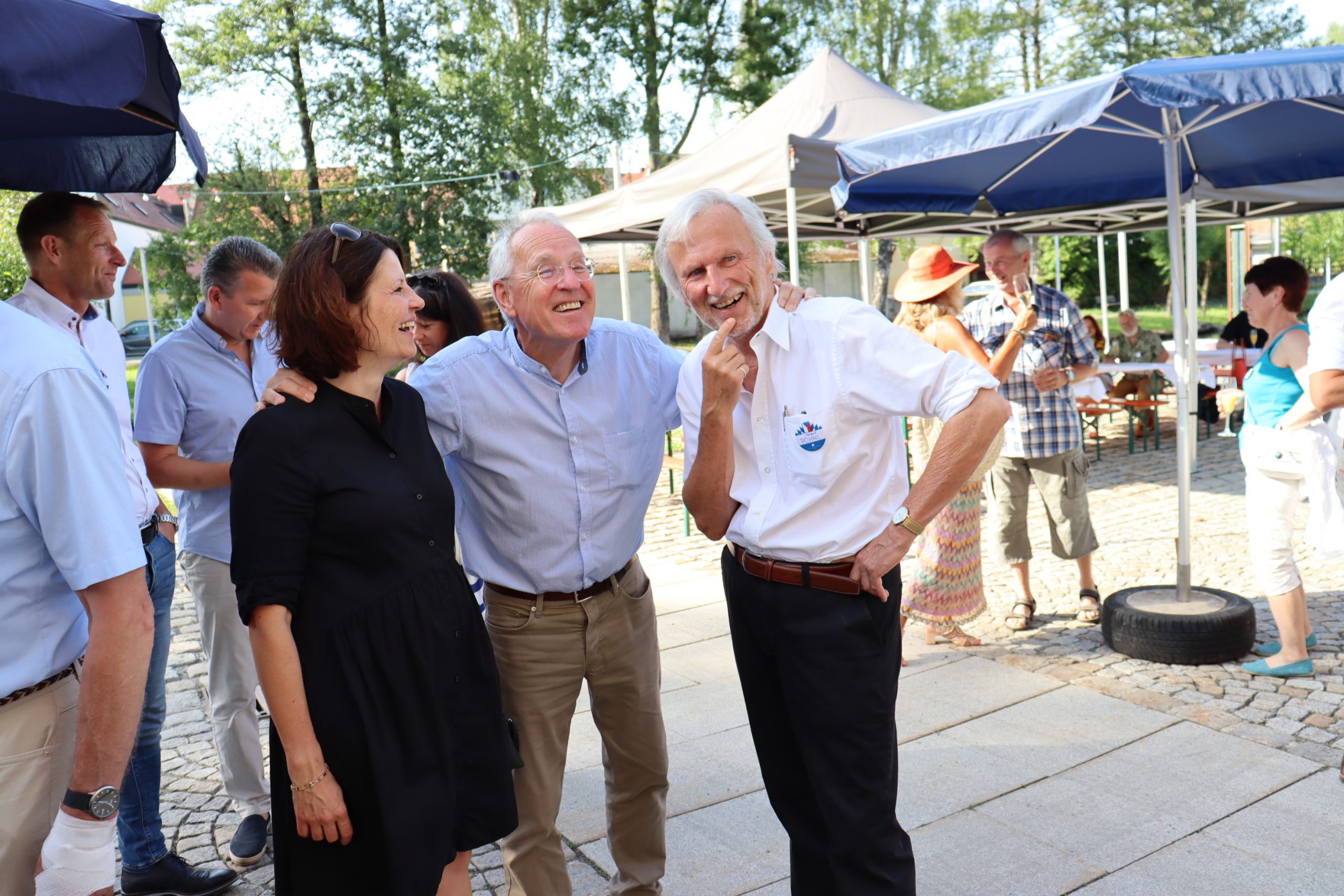 Äußerst gut gelaunt ließen die Gäste am Montag die Sommerempfangspause der letzten beiden Corona-Jahre hinter sich. Die gute Stimmung zog sich durch den genzen warmen Sommerabend. Sie drückte sich in den Grußworten der Ehrengäste aus bis zum Ausklang mit einer Schar tanzbeinschwingender Gäste. Wie beim Empfang draußen heitere Gesichter beim Rundgang durch die Sommerausstellung auf den drei Etagen des CeBB, ausgelöst von den Fotokünstlern Herbert Pöhnl und Edmund Stern der mit ihrer Foto-Hommage an Bürgermeisterinnen und Bürgermeister beiderseits der Grenze.