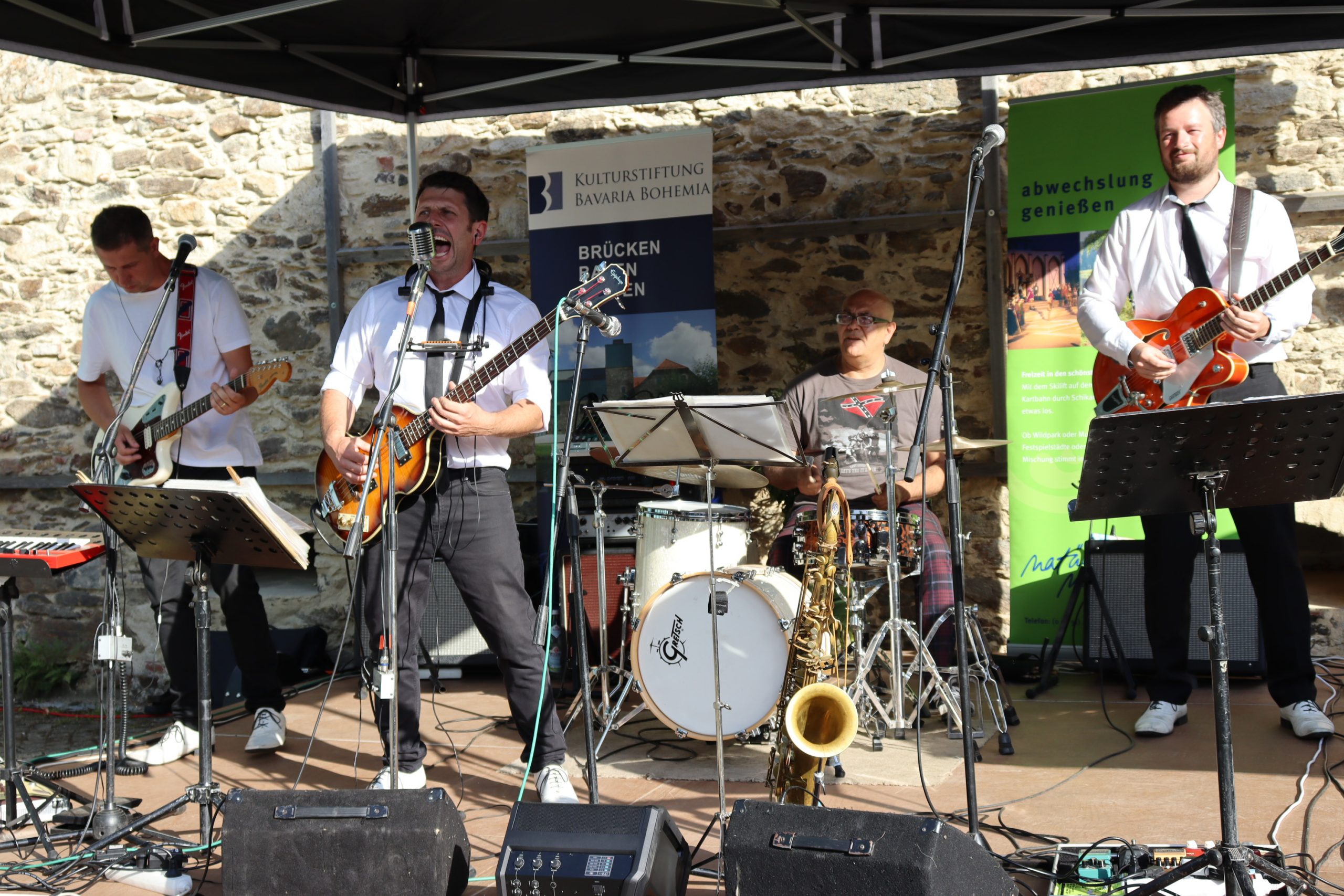 Der stellv. Präsident der Region Pilsen, Petr Vanka, knüpft daran an und erinnert, dass die freundschaftliche Atmosphäre für grenzüberschreitende Kunst und Kultur im CeBB ohne viele zu übersetzende Worte zu begreifen ist. „Wir verstehen kein Wort, doch am Ende des Tages ist die Seele erfreut“, so sein Fazit. Erstmals erhält die Kulturstiftung Bavaria Bohemia Gelegenheit, beim Sommerempfang ihr Engagement der Öffentlichkeit vorzustellen. Stiftungsvorstand Dr. Rudolf Ebneth berichtet über namhafte Zustiftungen der Sparkasse im Landkreis Schwandorf und des Landkreises Neustadt/WN in diesem Jahr. Damit erweitert sich der Spielraum für die Unterstützung von Aktionen des CeBB. Das Ziel ist, im kommenden Jahr zum 10-jährigen Bestehen das Stiftungskapital erneut deutlich zu erhöhen. „Frauen haben das letzte Wort“ klingt für manche Männer nicht so nach deren Geschmack, doch bei Irene Träxler, stellv. Vorsitzende von Bavaria Bohemia e.V. und Repräsentantin des Trägervereins, kommt ihre zutreffende Feststellung als letzte Rednerin im Grußwortreigen äußerst charmant rüber. Sommerlich behütet in einem Kleid in bunten Sommerfarben lobt sie die entspannte Atmosphäre, das gesamte CeBB-Team mit Veronika Hofinger an der Spitze, die ehrenamtliche Unterstützung, die Band aus dem Nachbarland und weiter die beiden Fotokünstler, die sie bittet, ihr Grußwort mit Gedanken zur Ausstellung zu ergänzen.