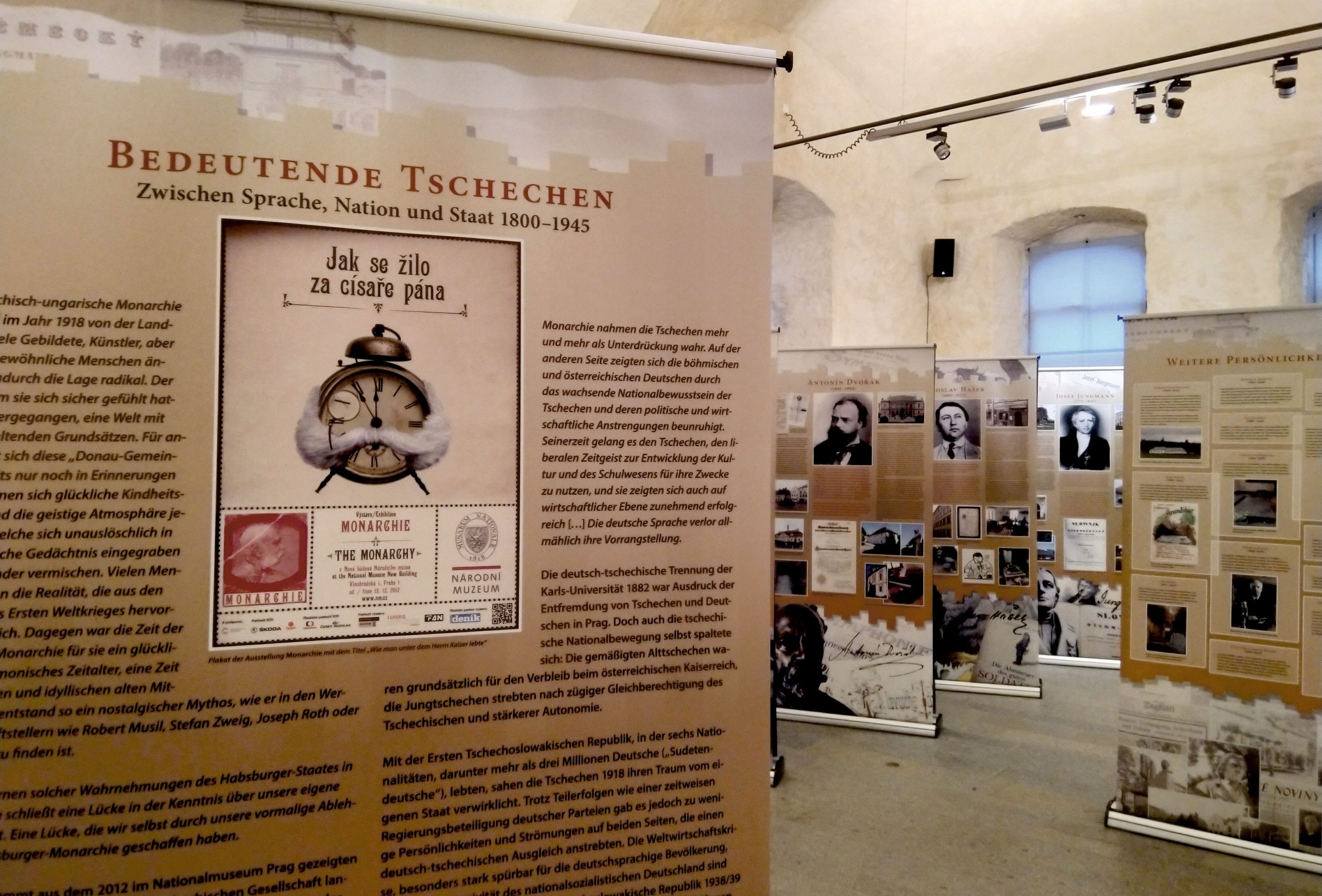 Anfangs standen für das Ausstellungsprojekt „Zwischen Sprache, Nation und Staat 1800-1945“ an die achtzig Namen von Tschechen in der Rechercheliste von Dr. Wolfgang Schwarz, Kulturreferent für die böhmischen Länder beim Adalbert-Stifter-Verein in München, dem Autor der schon an zehn Orten gezeigten mobilen Ausstellung. Eingangs schilderte er den schwierigen Prozess, die Fülle der Persönlichkeiten auf die fünfzehn bedeutendsten in dieser Umbruchzeit zu reduzieren. „Die Ausgewählten sollten einerseits die Empfindungen der Tschechen widerspiegeln, andererseits sollten die schließlich Portraitieren als Schriftsteller, Wissenschaftler, Künstler, Politiker, Musiker, Wissenschaftler, Techniker, Widerstandskämpfer und Journalisten zur Crème de la Crème dieser Epoche gehören.“ Im Mittelpunkt von Katalog und Ausstellung stehen Persönlichkeiten mit enger Beziehung zur deutschen Sprache und Kultur und zur Habsburgermonarchie. Zwei Frauen sind in dieser noch sehr von Männern dominierten Zeit darunter: Božena Němcová, bekannt als Schriftstellerin und Erzählerin des Märchens „Drei Haselnüsse für Aschenbrödel“ und Ema Destinová / Emmy Destinn, eine unter diesen beiden Pseudonymen auftretende Opernsängerin, die ihrer Zeit (1878 – 1930) als beste dramatische Sopranistin galt.