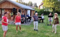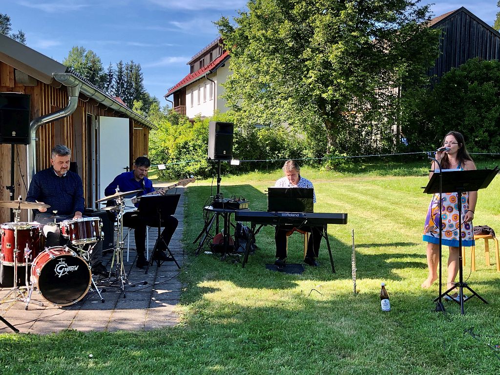 Bei der mährischen Band „JAZZ BASE“ war nichts von der 400 km langen Anreise zu spüren. Fast drei Stunden spielten die drei Musiker und die Sängerin beschwingt durch den Sommerabend. Bei den letzten Stücken gesellten sich ein paar Tanzbegeisterte auf die Wiesenbühne. Sie animierten die Band zu ein paar Zugaben, die mit dankbarem Publikumsapplaus honoriert wurden. Gleich neben der Bühne offerierte das Team vom CeBB Getränke und Steckerleis, das als Dessertschmankerl für viele das i-Tüpfelchen beim Picknick war.