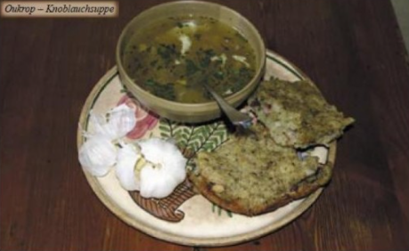 Kümmel und Salz in Wasser aufkochen. Mit Mehl und Butter eine helle Einbrenne machen. Fein geschnittenen Knoblauch in einer Schüssel zerreiben und dünne Brotscheiben dazu geben. Fertige Einbrenne in die kochende Suppe einrühren und das Brot sofort damit übergießen. Kurz bedeckt stehen lassen.