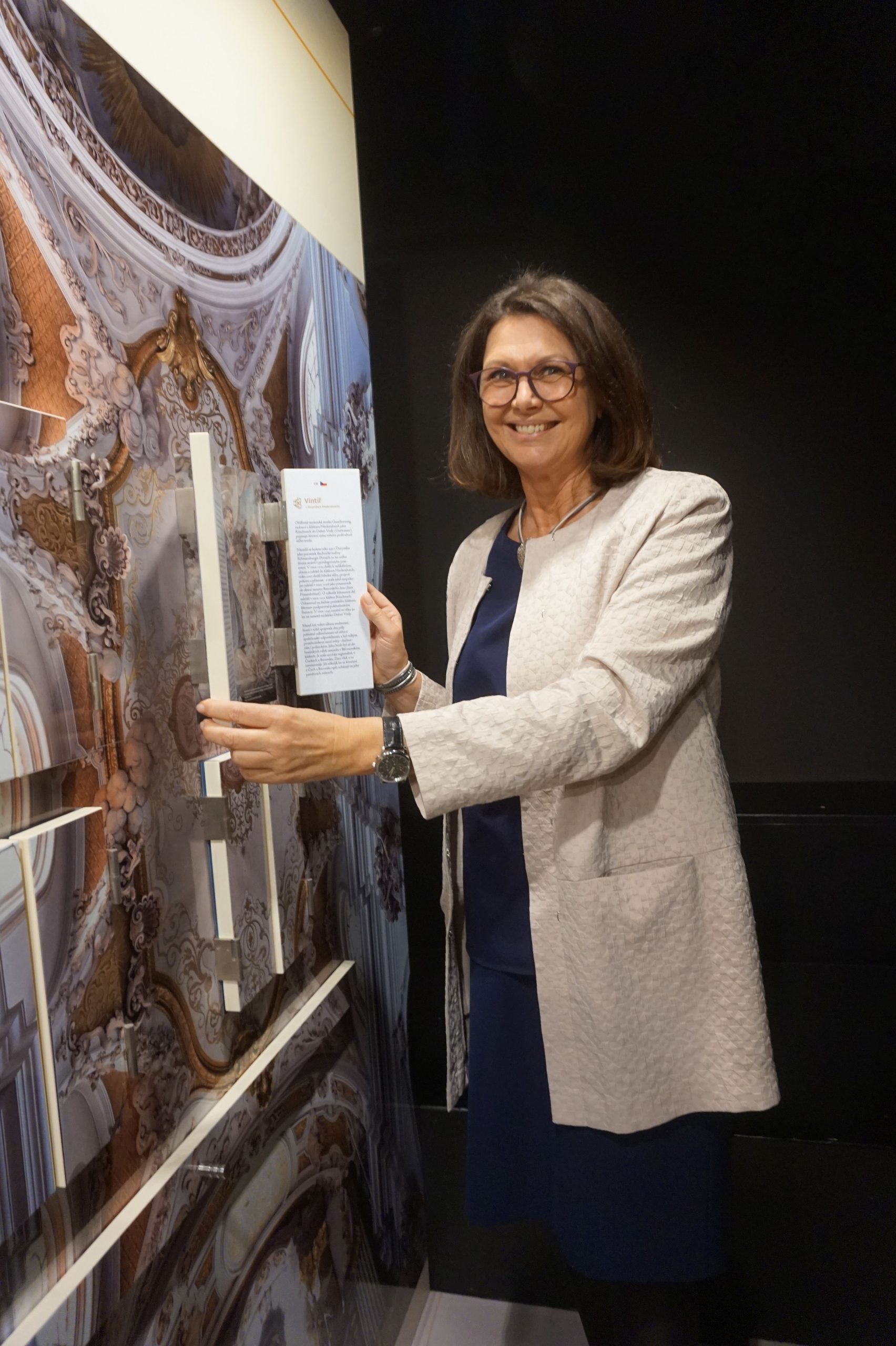 Die Augen der Präsidentin und der Abgeordneten strahlen, als sie im bb-media auf eine kurze Bilderreise durch die Bayerisch-Böhmische Barockregion mitgenommen werden. Barocke Schlösser, Basiliken, Gärten, Figuren, Baumeisternamen von Asam bis Dientzenhofer reihen sich auf der Großleinwand aneinander. Mit diesen Anregungen Besucher des CeBB zu animieren, Reisepläne zu schmieden, zeigt, was für eine kulturtouristische Bedeutung das CeBB für die bayerisch-tschechische Grenzregion hat. Mit Begeisterung öffnet Landtagspräsidentin Ilse Aigner ein Fensterchen in einer Wandinstallation, hinter der sich ein barockes Kleinod verbirgt. „Fast wie bei einem Adventskalender“ meint sie gerührt. Über die Entwicklung, die Bavaria Bohemia e.V. und das CeBB in den inzwischen 16 Jahren seit der Eröffnung genommen haben, spricht CeBB-Leiterin Veronika Hofinger anschießend im Raum bb-dialog. Unter der Überschrift „was tun wir, warum tun wir es und wie arbeiten wir“ nützt sie eine Viertelstunde, um dem Landtagspräsidium das breite Tätigkeitsspektrum des CeBB zu beschreiben. Die Herausforderungen der Zukunft sieht sie im Erreichen größerer finanzieller Stabilität. Sie will Wege finden, weniger von zeitlich befristeten Förderprojekten abhängig zu sein. In der intensiven grenzüberschreitenden Zusammenarbeit zum Grünen Band, das Schritt für Schritt UNESCO-Weltnatur und -Kulturerbe werden soll, liegt für das CeBB und die bayerische-tschechische Grenzregion eine große Chance. Zu diesem Thema fand sie Unterstützung in der Argumentation bei der Historikerin Kristýna Pinkrová und Tomáš Peckert, Direktor des CHKO Český les, als Co-Referenten. Zum Abschied nochmal Komplimente von allen Seiten für die großartige Leistung, die von Schönsee ausgeht und von München bis nach Prag ausstrahlt. Dazwischen Regensburg und Pilsen als weitere wichtige Ankerpunkte.
