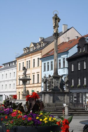 In der Stadtmitte steht das einstöckige Schloss mit Ecktürmen im Frühbarockstil, in dem das Kreismuseum von Sokolov untergebracht ist. Auf dem anliegenden alten Marktplatz befinden sich einige Kulturdenkmäler – die Kirche von hl. Jakob dem Größeren aus den Jahren 1632-34. Auf der gegenüberliegenden Seite steht das ehemalige Kapuzinerkloster mit Frühbarockkirche des hl. Anton von Padua aus den Jahren 1663-1667. Unter der Kirche befindet sich die Kapuziner Gruft mit dem Familiengrabmal von Nostic aus Sokolov. Der Brunnen mit einer Plastik vom Falkenjäger Sebastian ist eine weitere Sehenswürdigkeit auf dem Marktplatz. Die Marienpestsäule mit Statuen von vier Heiligen wurde im Jahre 1995-1996 rekonstruiert.