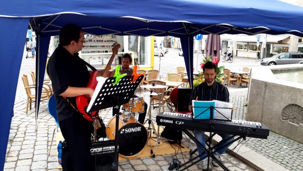 Leichte Jazzklänge der Karlsbader Band „Trialog Jazz“ zogen die Gäste in die Cafés und Restaurants am Marktplatz in Schwandorf. Die Matinee am Samstag, 15.08.2020 reihte sich in das Kulturstadtprogramm vor dem Kulturstadt-Pavillon des Centrum Bavaria Bohemia und der Stadt Schwandorf ein. Ermöglicht wird das Kulturstadtprogramm durch das bayerische Heimatministerium, den Landkreis und die Stadt Schwandorf sowie weitere Förderer.