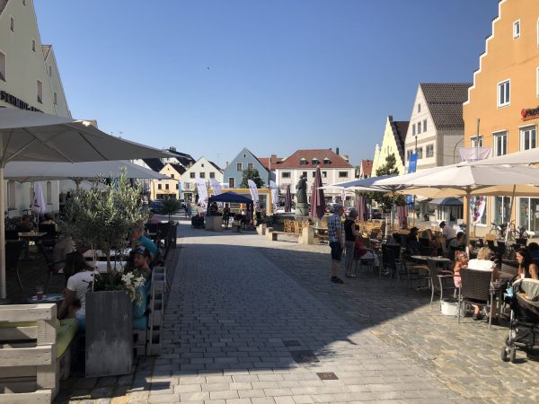Die Außensitze der umliegenden Gastronomiebetriebe waren gut gefüllt, sodass sich die Gäste bei einem ausgedehnten Frühstück, einer kühlen Erfrischung oder einem leckeren Eis an den sanften Klängen erfreuen konnten. In gebührendem Sicherheitsabstand, den die Hygienevorschriften erforderlich machten, nahmen einige musikbegeisterte Besucherinnen und Besucher auf zusätzlichen Sitzmöglichkeiten in unmittelbarer Nähe des Ensembles Platz. Herr Zbyšek Brůj, ehemaliger Praktikant des Centrum Bavaria Bohemia in Schönsee und Absolvent des Pilsener Konservatoriums, hielt die Gäste mit kurzen informativen Ansprachen auf Deutsch immer auf dem Laufenden. Nach einer Zugabe und unter stehendem Applaus verabschiedeten sich die drei Musikerinnen und Musiker, mit dem Wunsch auf ein baldiges Wiedersehen in Schwandorf und im Projekt „Kulturstadt Bayern-Böhmen“.