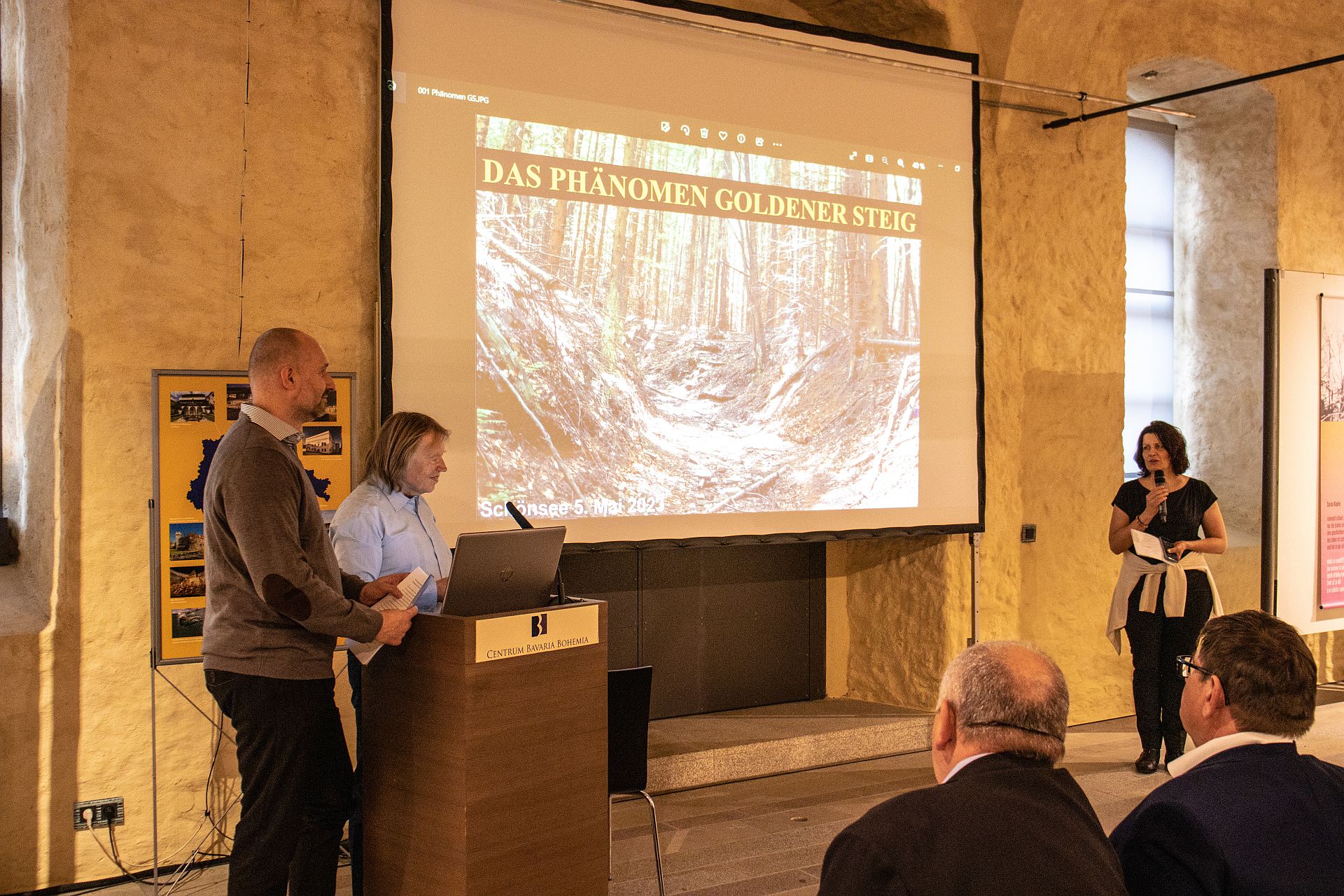 Die Präsentationen auf der großen Leinwand in der Gewölbehalle nehmen die Gäste mit auf eine touistische und kulturelle Entdeckungstour quer durch Südböhmen. Die Reise beginnt mit Bildern der bedeutendsten Tourismusdestination, natürlich verbunden mit der herzlichen Einladung zu einem Sommertrip. Dann begleitet der Leiter des Museums Písek einen fotografischen Rundgang durch sein Haus, dem sich Robert Malota anschließt, der in der Kreisstadt Strakonice Einblicke in die gelungene Sanierung der Burg gibt. Sie ist wahrlich eine Dominante im Stadtbild, in der im Mittelalter die weltliche und die kirchliche Macht, wie auf dem Prager Hradschin, gemeinsam residierten. Heute ist die Burg ein Kultur- und Gesellschaftszentrum, das in den letzten Jahren für 5,9 Mio Euro aufwendig rekonstruiert wurde – ein Kraftakt, der nur Dank europäischer Fördergelder, Zuwendungen aus dem Staatshaushalt und der Region Südböhmen zu stemmen war. Leider kann die in neuem Glanz erstrahlende Burganlage Wunden der 70er Jahre, als in der Zeit der kommunistischen Herrschaft große Teile der historischen Altstadt dem Bau einer Brücke und einer Fernstraße weichen musste, nicht mehr heilen. Ein paar Kilometer weiter liegt am Fuß des Böhmerwalds Prachatice, für die Schönseer, Stadlerner und Tiefenbacher Spitzenklöpplerinnen ein Begriff mit seinem Spitzenklöppelmuseum. Die Stadt ist das südböhmische Pendant zur Oberpfälzer Spitzenklöppelkunst, 2016 geadelt durch die Aufnahme in das bayerische Landesverzeichnis des immateriellen Kulturerbes der UNESCO. Tiefen Eindruck hinterließ am Schluss der Präsentationen die Fotogalerie über die Erforschung des tausend Jahre alten Goldenen Steigs, ein Phänomen, wie ihn die südböhmischen Experten apostrophieren. “Zuerst waren es Saumpfade, daraus entstanden Handelswege, die im Mittelalter Böhmen mit der Donau verbanden – 30 % haben wir bisher vom Goldenen Steig rekonstruiert“ berichtet František Kubů, der auch die grenzüberschreitende touristische Bedeutung hervorhob.